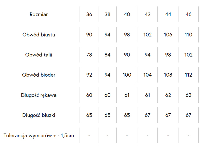 | Długość bluzki | 65 | 65 | 65 | 67 | 67 | 67 |