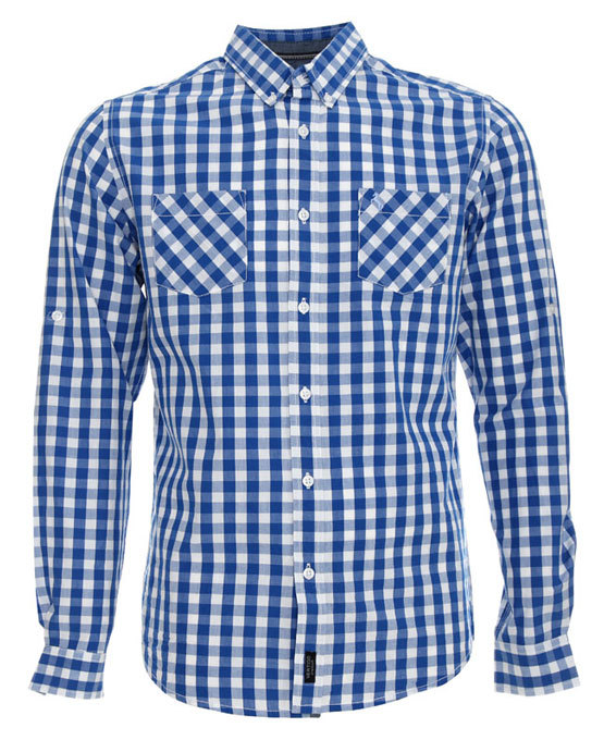 Tkaniną jeansową wyłożony również kołnierz, karczek, krawędź z boku i wzmocnione zapięcie koszuli.